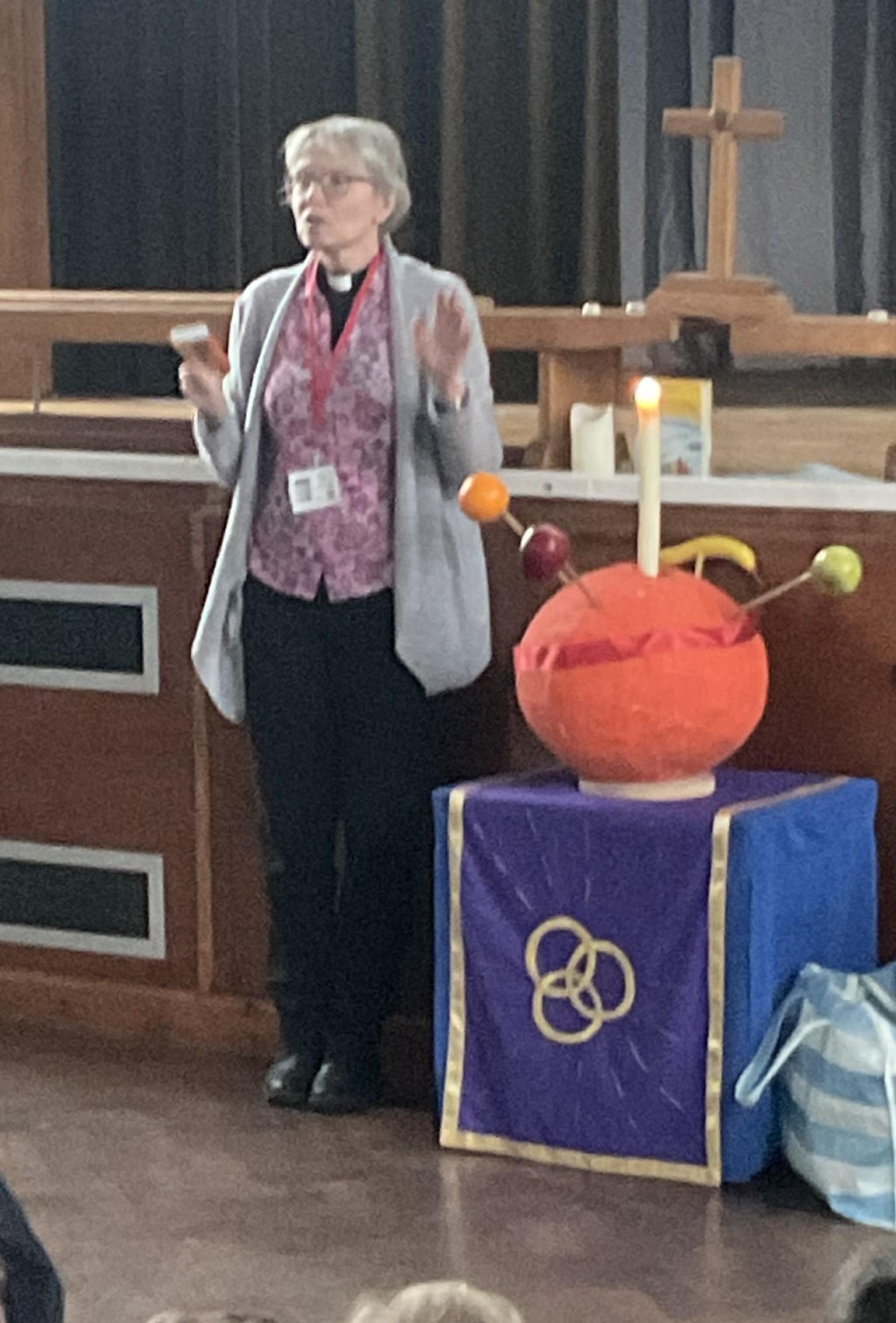 Our local congregation regularly pray for us and we share our Education Sunday Service and walk with them.  There are so many talented people in the congregation who help us in school in so many ways.  Recently two of the ladies in the congregation kindly turned the children's designs into altar cloths for us, so we have the same colours on the cloths as there are in the church throughout the year.