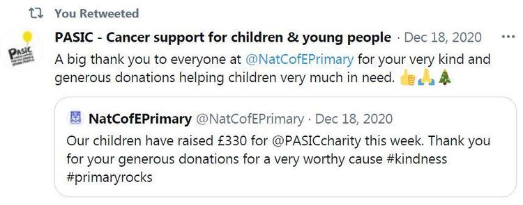 PASIC is a local charity close to our hearts at National. It aims to improve the quality of life for children and young people with cancer by providing emotional, social and practical support for families. To raise money for this important charity, the choir chose to sing carols after school for a week. In total, the children raised £330!