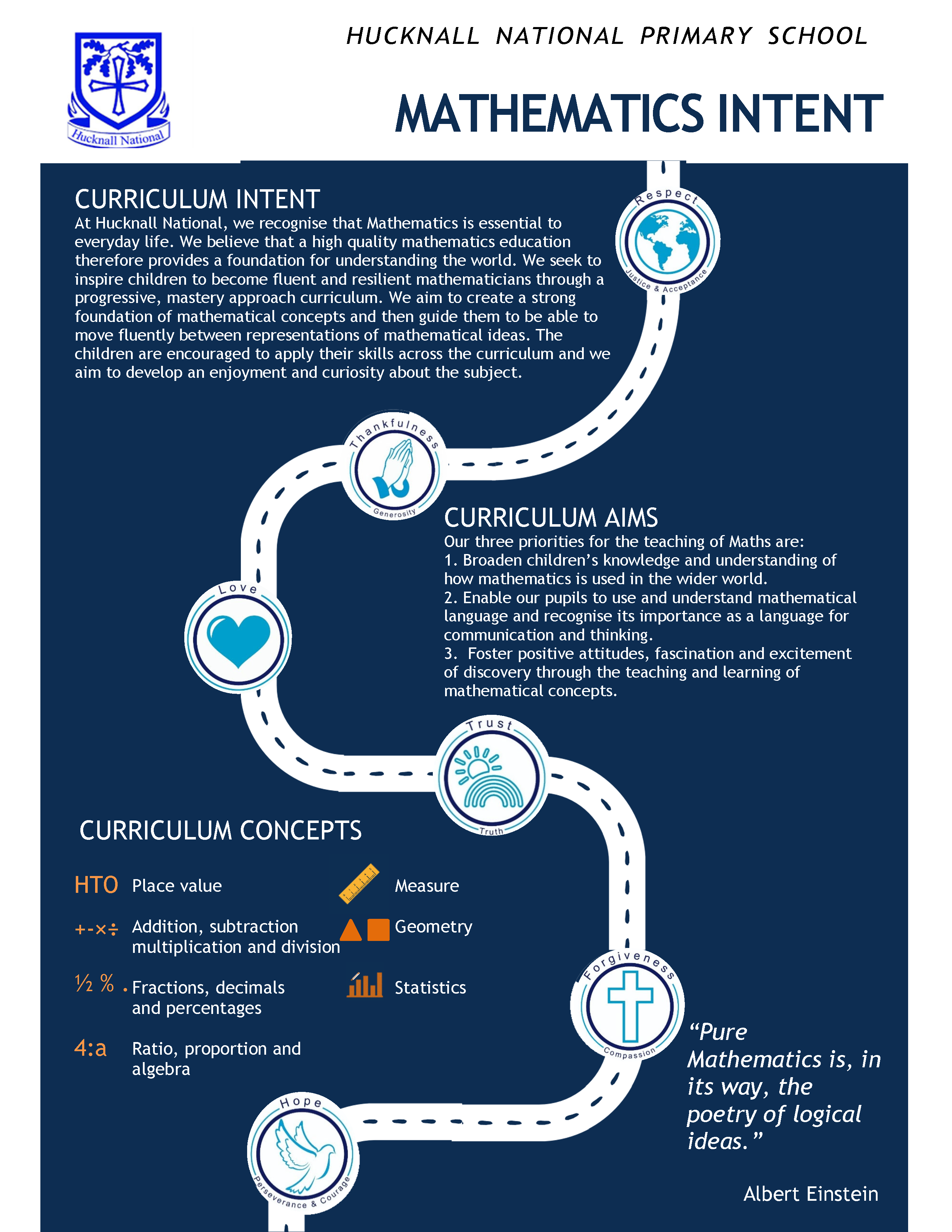At Hucknall National, we recognise that Mathematics is essential to everyday life. We believe that a high quality mathematics education therefore provides a foundation for understanding the world. We seek to inspire children to become fluent and resilient mathematicians through a progressive, mastery approach curriculum. We aim to create a strong foundation of mathematical concepts and then guide them to be able to move fluently between representations of mathematical ideas. The children are encouraged to apply their skills across the curriculum and we aim to develop an enjoyment and curiosity about the subject