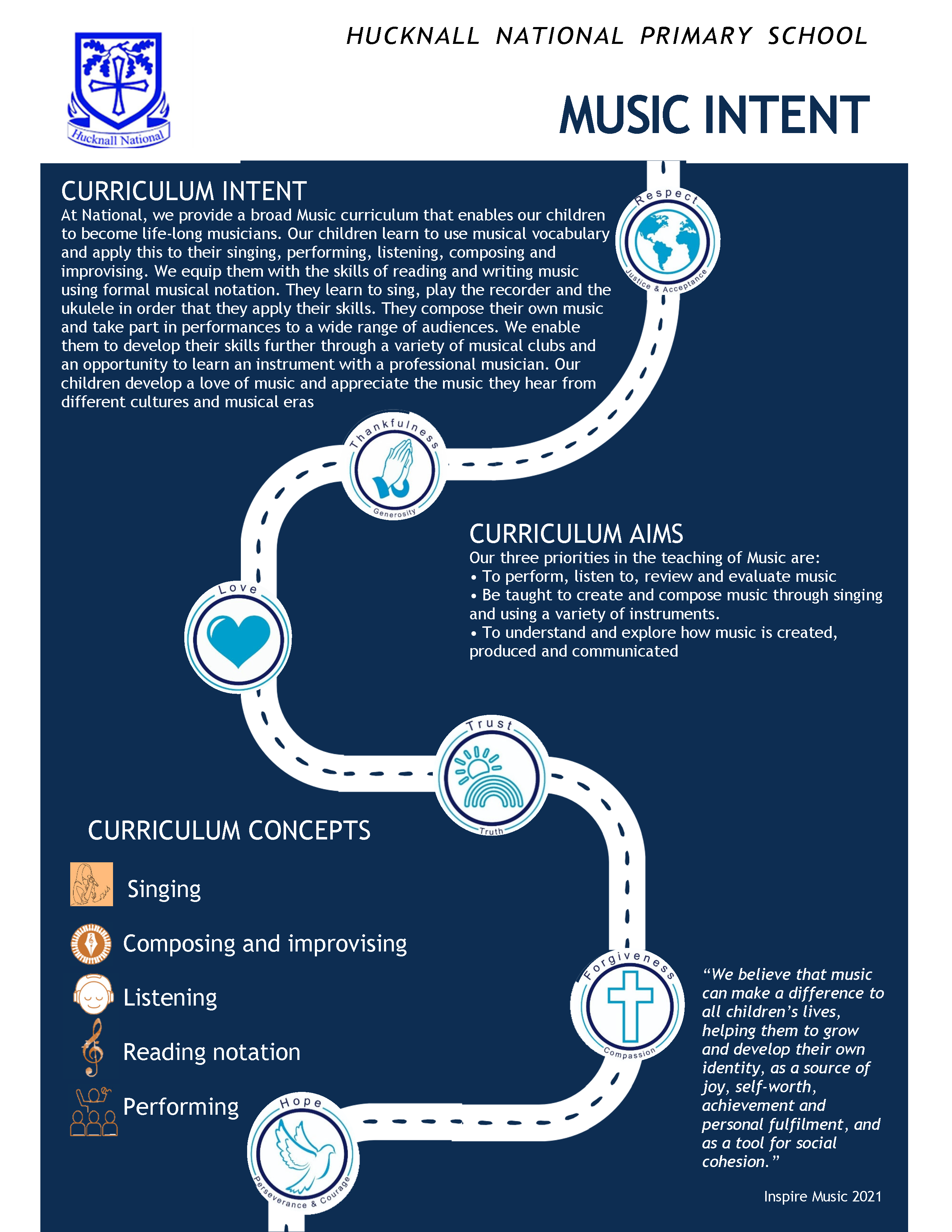 Our Christian values, help to underpin Music at Hucknall National C of E Primary School.