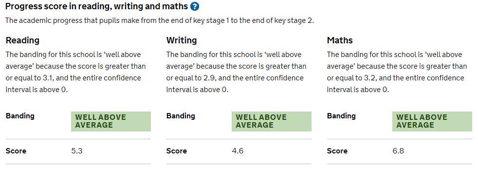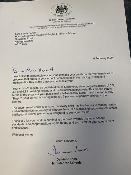 We have been recognised by the Minister for Schools, Damian Hinds for the outstanding progress that our pupils make between Key Stage 1 and the end of Key Stage 2 in reading, writing and mathematics. This puts our school in the top 5 per cent of primary schools in the country.