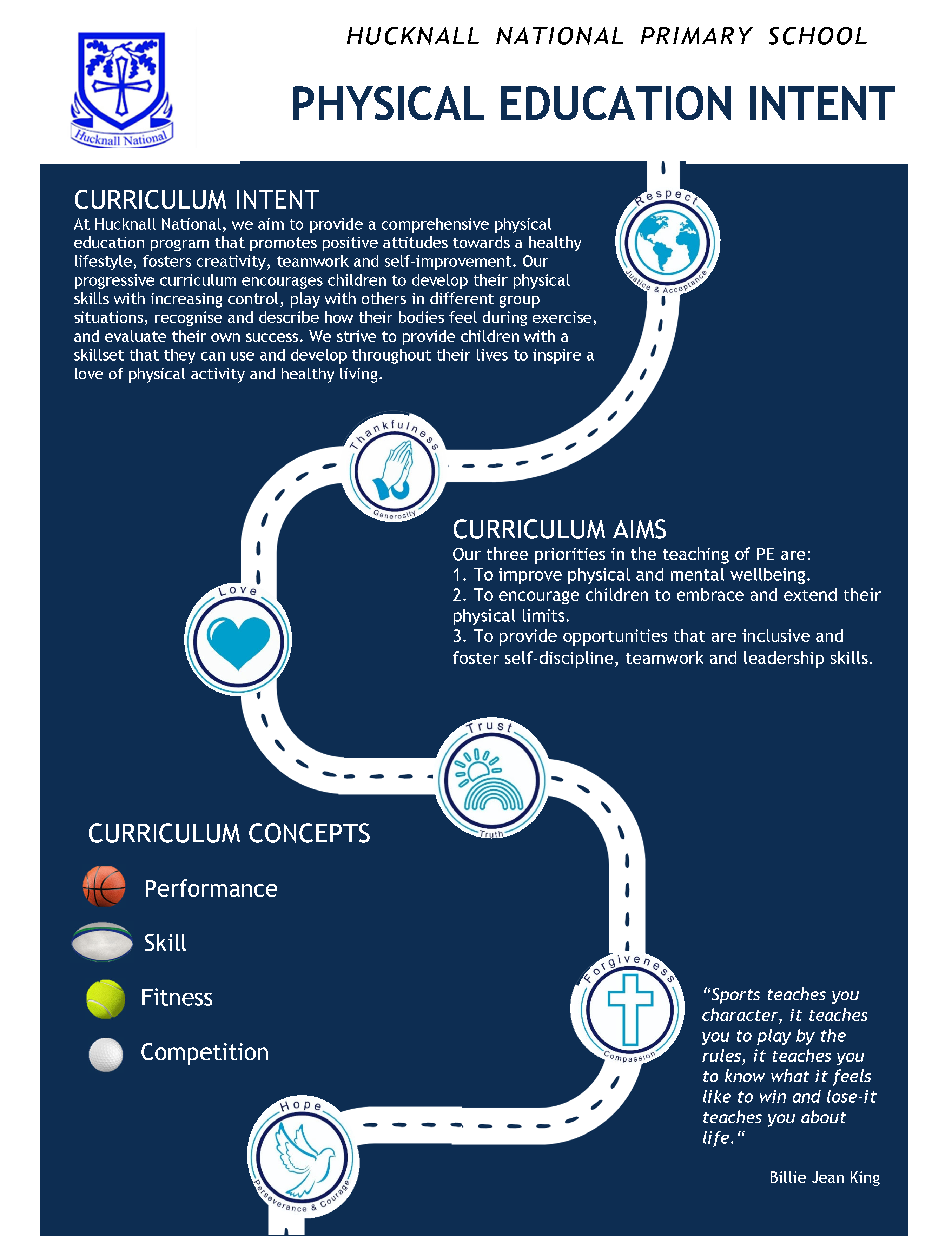 At Hucknall National Primary School our school motto is ‘Growing together in learning, love and faith’. Our Physical Education curriculum is linked to all four areas of our curriculum vision quadrant: