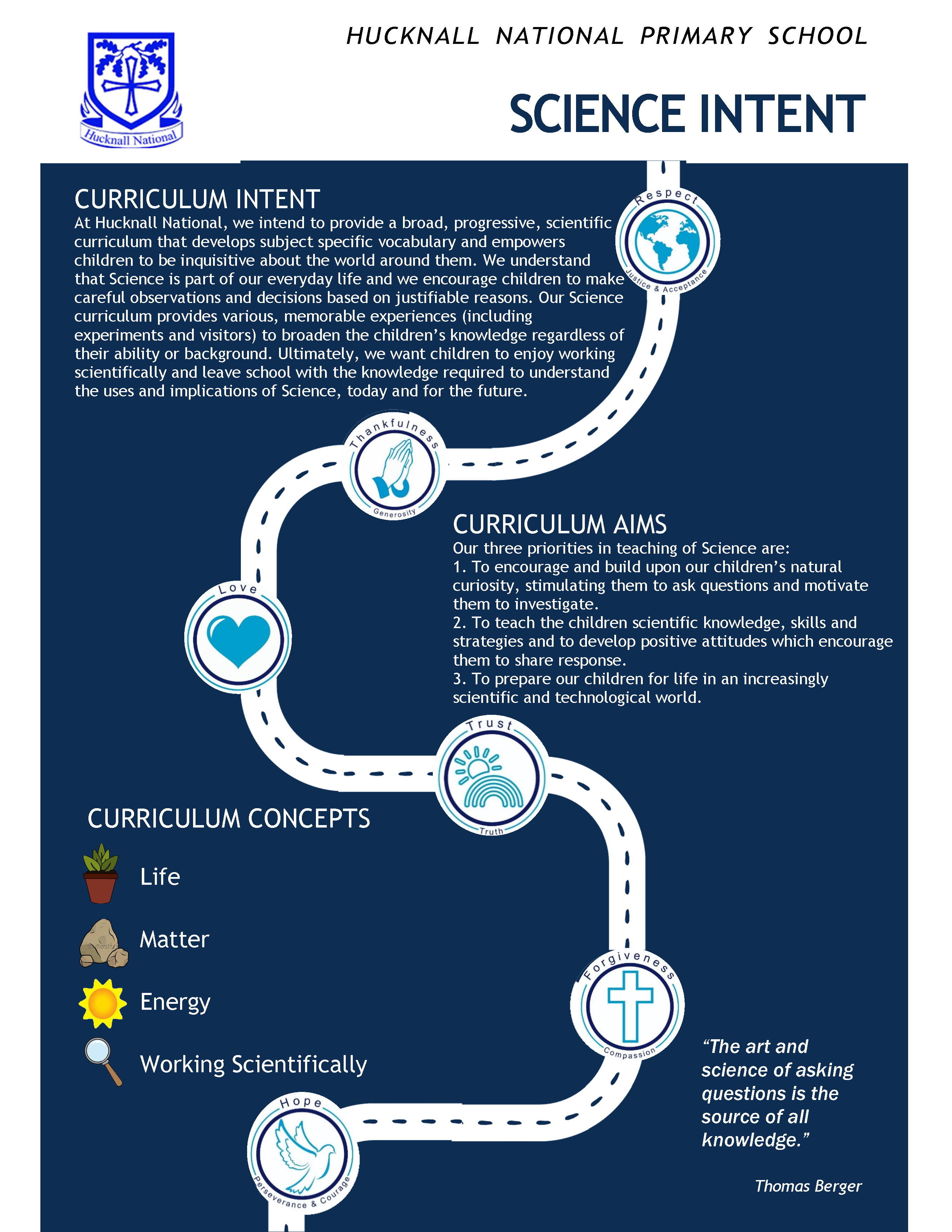 At Hucknall National, we intend to provide a broad, progressive, scientific curriculum that develops subject specific vocabulary and empowers children to be inquisitive about the world around them. We understand that Science is part of our everyday life and we encourage children to make careful observations and decisions based on justifiable reasons. Our Science curriculum provides various, memorable experiences (including experiments and visitors) to broaden the children’s knowledge regardless of their ability or background. Ultimately, we want children to enjoy working scientifically and leave school with the knowledge required to understand the uses and implications of Science, today and for the future.