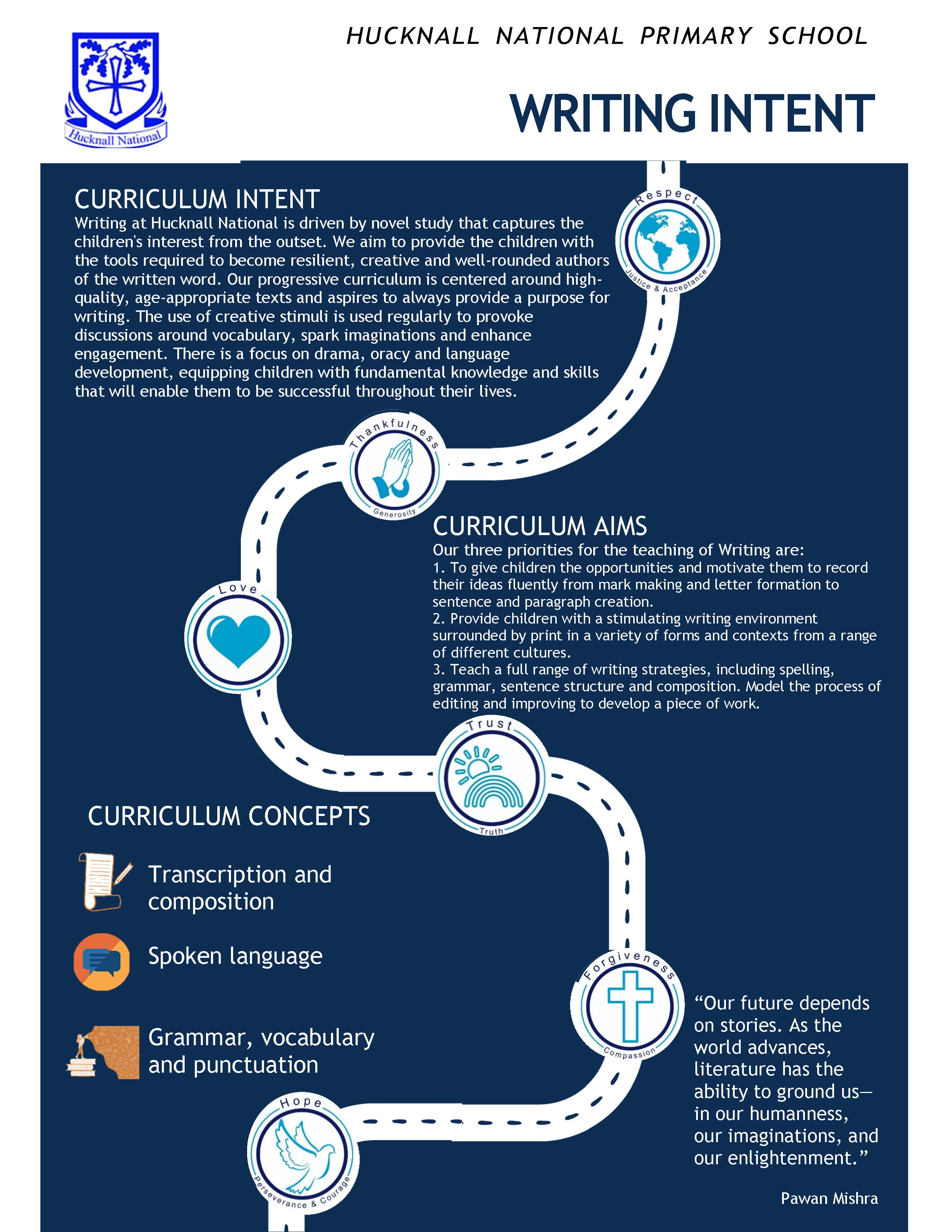 Once children have followed their 'central character' through the story, they have the opportunity to plan and write independently using their previous learning to shape their creative stories. Children at Hucknall National are encouraged to see writing as a journey; re-drafting and editing are used before writing is published. Writing extends across the curriculum with children being given opportunities to write for a range of different purposes outside of the writing lesson. All English based activities are extended with opportunities for Greater Depth, where children can take writing in their own directions. This usually includes elements of the FANTASTICs which are used to ‘deepen the moment’. All children are encouraged to deepen their writing further, regardless of their ability.